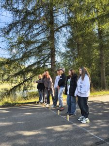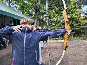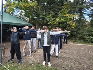 Po krótkim odpoczynku rozpoczęły się pierwsze zajęcia terenowe. Uczniowie mieli okazję spróbować swoich sił na ściance wspinaczkowej, gdzie pod okiem instruktorów ćwiczyli równowagę, koncentrację i odwagę. Następnie wzięli udział w warsztatach łuczniczych, podczas których poznali podstawy bezpiecznego posługiwania się łukiem i rywalizowali w strzelaniu do tarczy. Zajęcia te cieszyły się ogromnym zainteresowaniem i dostarczyły wielu emocji.