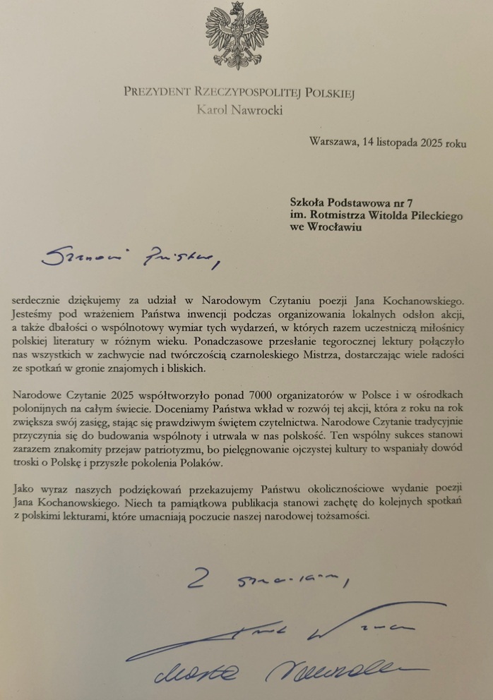 Z ogromną radością i dumą informujemy, że nasza szkoła otrzymała oficjalne podziękowanie od Prezydenta Rzeczpospolitej Polskiej za aktywny udział w tegorocznej edycji Narodowego Czytania Poezji Jana Kochanowskiego.
