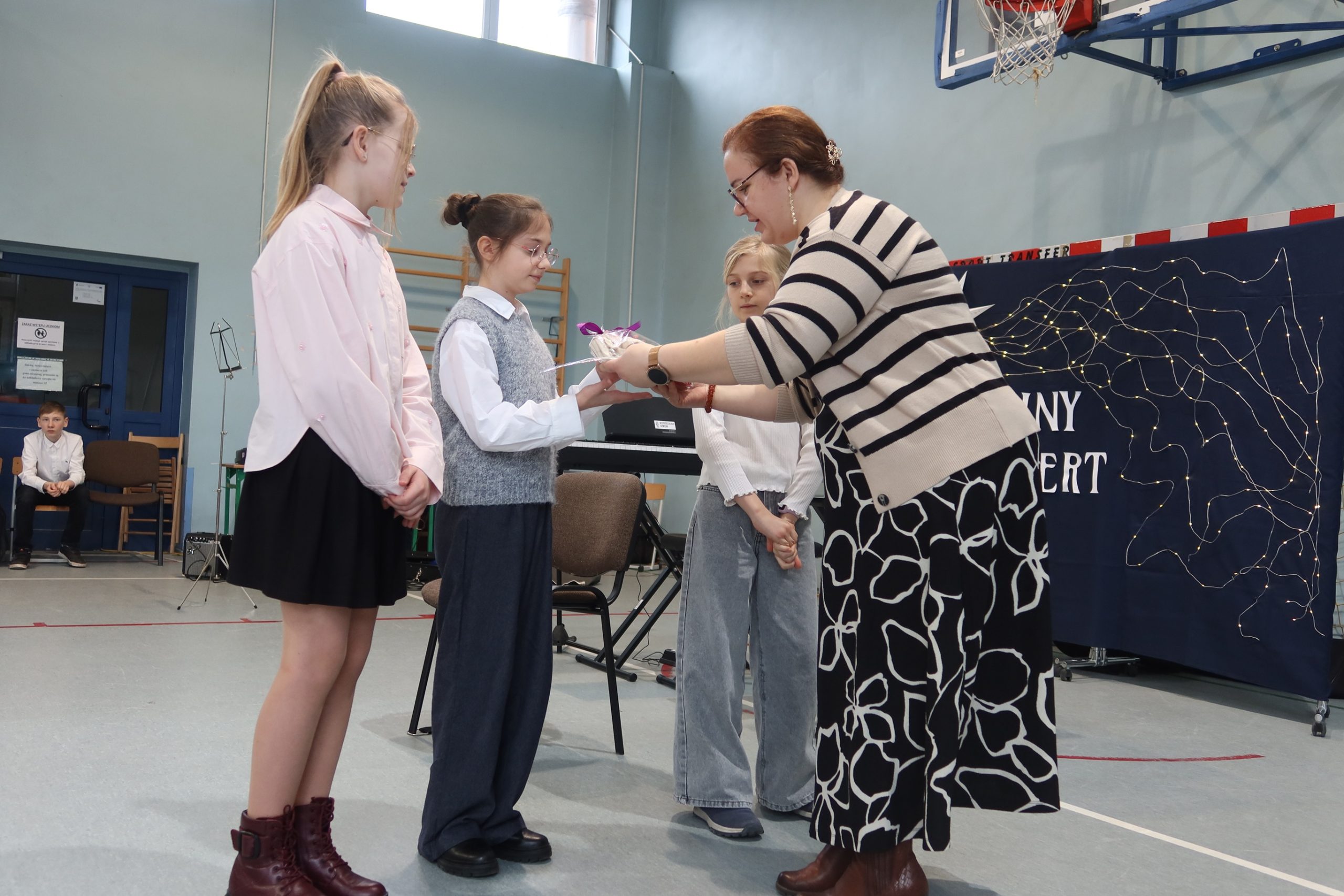 Koncert był również okazją do wręczenia uczniom nagród za udział w szkolnych konkursach o tematyce świątecznej. Występy oraz uroczyste rozdanie nagród spotkały się z ciepłym przyjęciem i zostały nagrodzone gromkimi brawami.