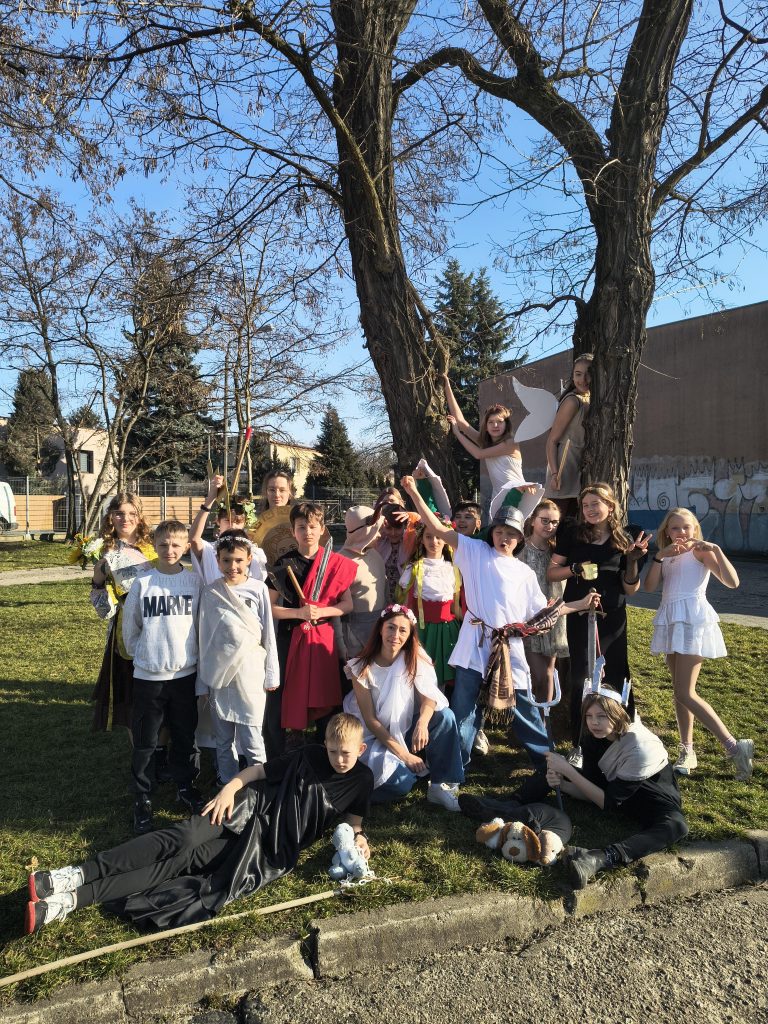 Każda z postaci miała okazję opowiedzieć swoją historię – o niezwykłych przygodach, odwadze, sprycie i wyzwaniach, z jakimi musieli mierzyć się bohaterowie mitów. Nie zabrakło ciekawych opowieści i humoru. Bohaterów mitologicznych można było spotkać w korytarzu naszej szkoły, na długiej przerwie, w trakcie której odbyła się parada.