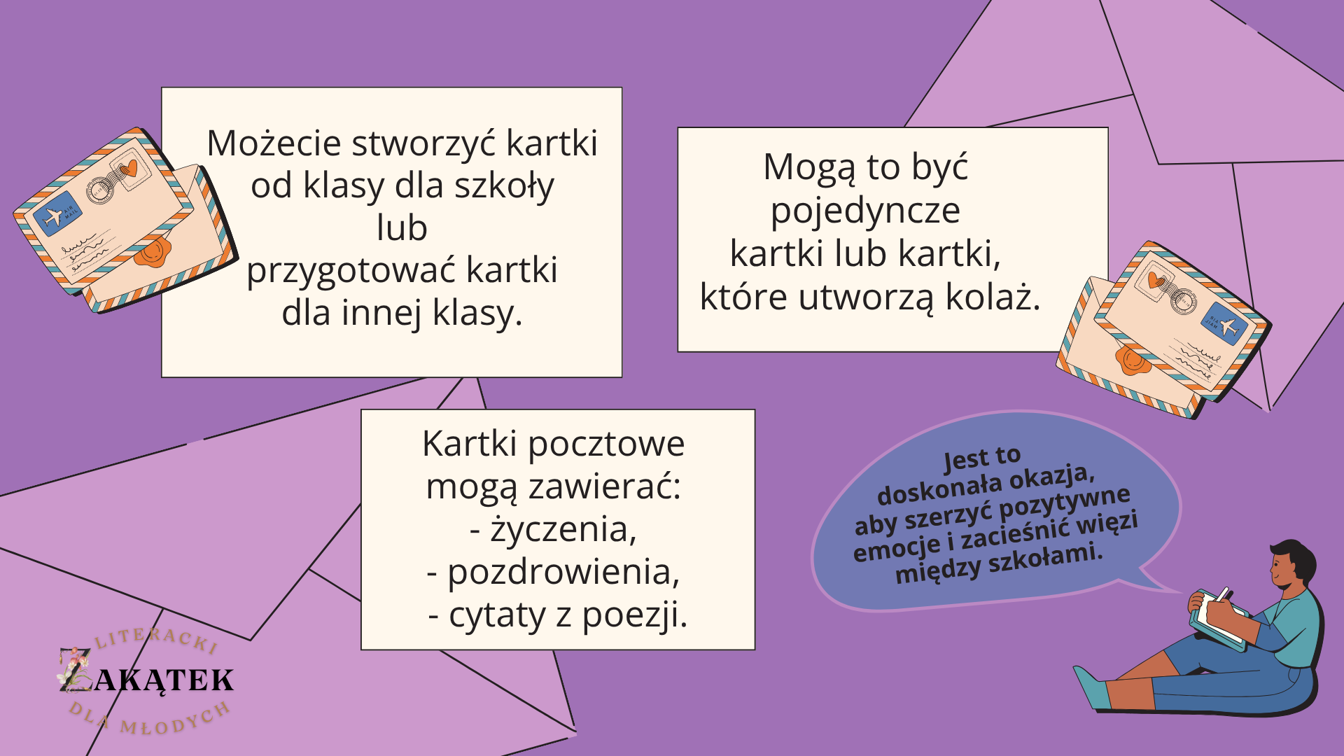 Zachęcamy do przygotowania kreatywnych kartek pocztowych, które mogą zawierać życzenia, pozdrowienia, cytaty z poezji lub inspirujące słowa.